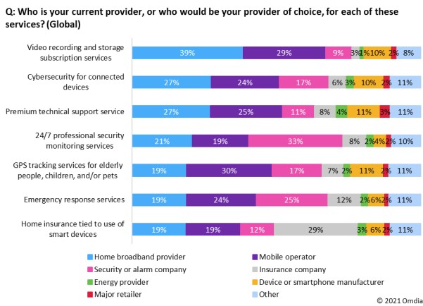 Omdia的2020年数字消费者洞察报告——智能家居调查(图1)显示,电信运营商确实在数字化消费者服务方面拥有非常强大的品牌认可度,例如视频云存储、网络安全和高级技术支持。关键在于要定期精简这些服务,同时还要与其他受欢迎的智能家居服务(例如专业家居安全和保险)集成在一起,并与其他专业提供商合作,从而进一步巩固该服务提供商在市场上的品牌。